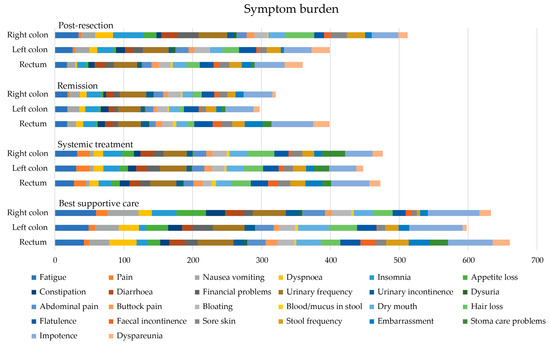 In the remission phase, symptom burden was numerically higher in patients with a rectal primary tumor compared to the right colon or left colon (Table 5). The symptoms that affected patient’s HRQoL after metastasectomy the most, regardless of PTL, were principally bowel- and sexuality-related (Figure 7). More symptoms in patients with rectal PTL compared with right and/or left colon were seen for constipation, flatulence, fecal incontinence, stool frequency, embarrassment, stoma care problems, impotence, and dyspareunia.
