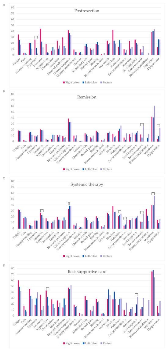 For the BSC phase, no statistically significant differences between different PTLs for symptom burden were noted. The functioning scale sum was lower for rectal PTL compared with right and left colon PTLs (Table 5). In BSC, patients with a right colon PTLhad more fatigue, pain, insomnia, and appetite loss compared to left and rectal primary tumors (Figure 7). Patients with a left colon PTL had more dry mouth and hair loss compared with a right colon and rectal PTLs. Patients with a rectal PTL complained more often about dyspnea, stool frequency, fecal incontinence, embarrassment, stoma care problems, and impotence compared to right or left colon PTLs.