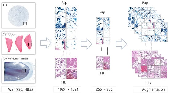 Because the size of the WSIs was too large for them to be input into the neural network directly, patch images with a size of 1024 × 1024 pixels were first cropped. The obtained patch images were then manipulated into an image with a size of 256 × 256 pixels. To increase the generalizability of the model by generating various images, the data were augmented using random horizontal flips, arbitrary vertical flips, and color corrections (Figure 1).
