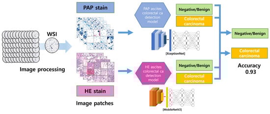 The image-processing and AI-detection-model algorithm. The DCNN models were separately trained on H&E- and PAP-stained images using the generated patch images. Xception and MobileNetV2, which had the highest binary classification accuracy, were selected as the optimal models.