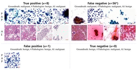 Disagreements in diagnoses between pathologists and AI. A comparison between AI diagnoses and those of pathologists revealed discrepancies. In 8 cases (true positive), all pathologists diagnosed malignant patches as benign, while only AI identified them as malignant. Conversely, no benign patches were diagnosed as malignant by all pathologists, but AI classified them as benign (true negative). Additionally, in one case (false positive, representative patches), AI interpreted a benign patch as malignant. Furthermore, 56 patches were classified as benign by AI alone (false negative) (patch image size, 256 × 256-pixels; scale bar = 50 um); * indicates representative sample patch images of false-negative cases.