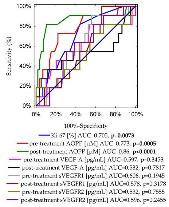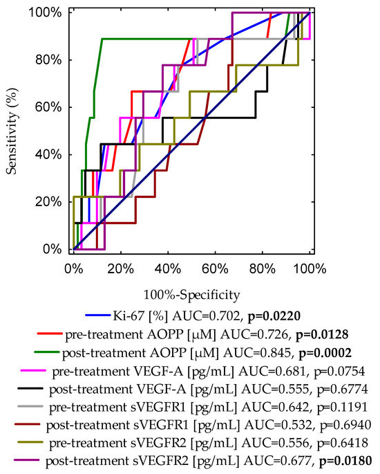 Finally, Figure 2 demonstrates a graph with nine ROC curves for the Ki-67 expression, pre- and post-treatment concentrations of AOPP, VEGF-A, sVEGFR1, and sVEGFR2. The most accurate indicator for disease recurrence presents an area of 0.86 under the curve, which was reached for post-treatment AOPPs (p < 0.0001).