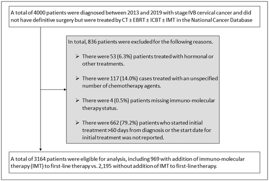 Schema for study selection and exclusions. Abbreviations: chemotherapy alone (CT); external beam radiotherapy (EBRT); intracavitary brachytherapy (ICBT); immuno-molecular therapy (IMT).