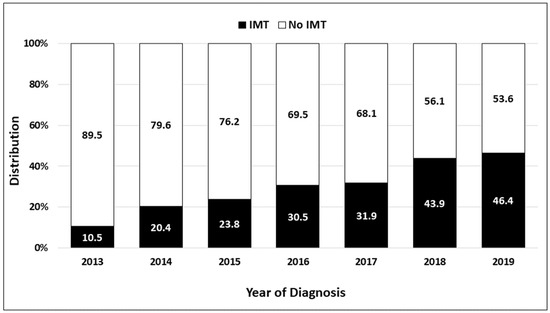 All statistical analyses were conducted on SAS version 9.4 (SAS Institute, Cary, NC, USA) using two-sided tests, with significance set at p < 0.05. Adjustments were not made for multiple testing. Differences in demographic and clinical variables between the IMT and non-IMT groups were evaluated using Chi-square test (for categorical variables) or t-test (for age at diagnosis). A stepwise logistic regression analysis (stratified by year of diagnosis and geographic region) was performed to estimate the adjusted odds ratio (OR) and 95% confidence interval (CI) for clinical factors that were independently associated with the use of IMT.