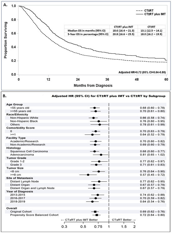 The median survival time in propensity-score-balanced patients who were treated with IMT was 18.6 months, compared to 13.1 months for those who were not treated with IMT (Figure 3A). The addition of IMT to a first-line therapy with CT ± RT significantly improved survival, with a 28% reduction in the risk of death (adjusted HR = 0.72, 95% CI = 0.64–0.80, p < 0.0001).