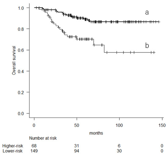 Kaplan–Meier curve showing the overall survival based on their 10-year predicted probability of overall survival (a: lower-risk group; b: higher-risk group).