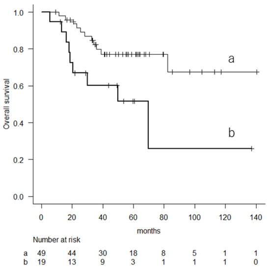 Among the patients with a higher risk, those with an mGPS of 1 or 2 had poorer OS (5-year OS (95% CI), 51.6% (25–72.9) compared to those with a score of 0 (5-year OS (95% CI, 77.2% (61.6–87.1), p = 0.013, log-rank test) (Figure 2).