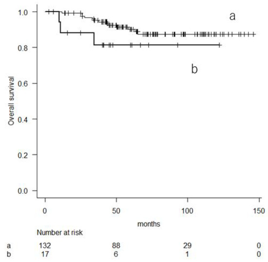 Kaplan–Meier curve showing the overall survival in patients with lower risk based on their 10-year predicted probability of overall survival (a: mGPS score of 0; b: HS-mGPS score of 1 or 2).