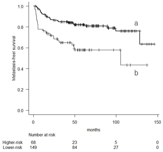 Kaplan–Meier curve showing the metastasis-free survival based on their 10-year predicted probability of overall survival (a: lower-risk group; b: higher-risk group).
