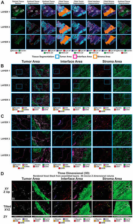 In agreement with the findings presented in Kuett et al. [26], we demonstrated that features, adjacent cells, vessels, etc., are closer in the Z dimension than in the X and Y dimensions. This speaks to the fact that clustering or neighborhoods are not two-dimensional objects they occupy a three-dimensional space. This means that many of the findings related to the relevance of immuno-supportive or immuno-suppressing may not be found in the same plane, but in the planes above or below. Even in the limited tissue examples used in this study, the complexities of the tumor, interface, and stromal compartments is visible in Figure 2B,C. With closer inspection, one can see that in the tumor sample of Figure 2C, CD66b positive cells were found in the upper left quadrant within a small space of each other in layer 1 and layer 3. When we consider the sections between these CD66b positive cells are within ~20 microns of each other, significantly closer as there are no other CD66b positive cells in layer 1. Reflecting on the second tumor area, this is also very visible with the CD45 positive immune population as it appears to cluster in the keratin positive tumor area. The Interface area, which involves CAFs, immune cells, and tumor cells is the most complicated and interesting area as we previously described [21,22]. The ability to align the datasets produced in this paper permits us to start asking advanced questions to further interrogate this important tissue region (Figure 2D).