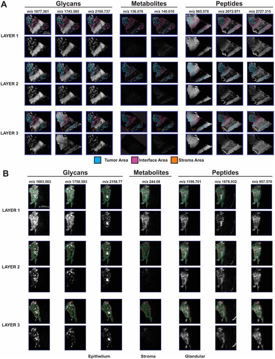At each layer in the section stack, mass spectrometry imaging was preformed to map localization of metabolites, glycans, and tryptic peptides, sequentially, from the same tissue section. After loading each dataset into SCiLS Lab (Bruker Inc., Billerica, MA, USA), features were manually selected from the average spectrum resulting in 948 metabolites, 164 glycans, and 586 peptides detected. Metabolites were selected with a peak width of 15 ppm while glycans and peptides were selected with a peak width of 10 ppm. Biomolecule images from each dataset were evaluated for features that correlated with segmented regions determined by COMET analysis of serial sections. Figure 4 highlights some of these localized features. Within the metabolite data, m/z 136.076 was found to be most abundant in stroma and interface areas, while m/z 140.010 was more uniformly distributed but showed a slight decrease in stroma of HGSOC sample (Figure 4A). Three N-linked glycans at m/z 1077.361 and 2100.737 (core fucosylated and sialated) showed high abundance in the areas of stroma, and interface with lower abundance in tumors showed high abundance in areas of stroma and interface with lower abundance in tumor areas while m/z 1743.585 (high mannose) showed higher abundance in tumor and interface (Figure 4A). Finally, tryptic digestion imaging was performed on the same sections. Selected ion images show m/z 958.578 highly abundant in areas of tumor and interface but absent from stroma. A peptide at m/z 2072.971 was found to be increased in tumor just outside the main band of stroma in the sections with low abundance detected across nearly all sections. The peptide at m/z 2727.315 showed the highest levels in stroma and tumor immediately adjacent to the large stromal band but had overall more diffuse localization across the sections throughout all 3 layers.