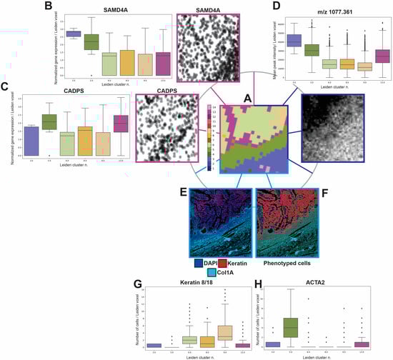 Demonstration at the region of interest level of the alignment of Leiden clusters with MSI and Comet data. (A) indicates the presence of Leiden clusters within one ROI, which is then indexed for alignment to the other datasets. (B) SAMD4A normalized gene expression (image) is measured for every bun50 ‘voxel’ within the Leiden cluster regions, showing differential expression across discrete Leiden clusters, primarily in stromal regions. (C) CADPS-normalized gene expression (image) shows higher prevalence in Leiden clusters 5 and 13, corresponding to the tumor:stromal interface. In (D), following alignment using the registered indexed cluster, a single peak from the MSI imaging dataset (m/z 1077.361), the MSI pixels corresponding to each bin50 Leiden cluster ‘voxel’ are quantitated in the box plot, showing a similar enhancement of peak intensity matching with stromal and tumor:stromal interface regions of the tissue. In (E), the DAPI (nuclei), Keratin (tumor epithelium) and Col1A (tumor stroma) immunostaining is shown alongside (F) segmented and phenotyped cells, which are then summed within each bin50 voxel to produce (G) box plots indicating the mean number of Keratin+ cells within each bin50 voxel, indicating higher abundance in Leiden clusters 6, 8 and 9, corresponding to tumor enriched Leiden clusters. (H) shows per-voxel cell numbers for ACTA2 (aSMA), with highest abundance at the tumor:stromal interface on Leiden cluster 5.