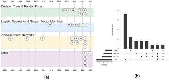 Timeline of clinical trial applying AI in the setting of CML. The trials are divided based on the AI strategies reported. (a) the timeline of publications by year and clustered by technique. The numbers refer to the IDs in the Table 2 (b) An upset plot showing how often the techniques were used. Mostly they have been used alone (the first 4 vertical bars: 9 + 3 + 2 + 2 = 16 times) and only 7 times more than one technique has been used in a paper. Only one paper tested all the four techniques (the last vertical bar, on the right). The horizontal bars show the usage of any cluster.