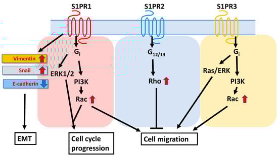 S1PR signaling pathways in liver regeneration and HCC progression. Sphingosine-1-phosphate (S1P) acts as a lipid mediator of various cellular responses such as cell cycle, proliferation, and migration, and acts primarily through S1P receptors (S1PR1 to S1PR3). S1PR1 mediates cell migration via the Gi/Rac pathway, whereas S1PR2 mediates inhibition of migration via the G12/13/Rho pathway. SIPR3 also promotes cell migration via the Gi/Rac or Ras/ERK pathway. S1PR1 overexpression was positively correlated with vimentin and MMP-9 expression and negatively correlated with E-cadherin expression. In addition, S1PR1 overexpression induced EMT and enhanced tumor invasion and cancer stemness.