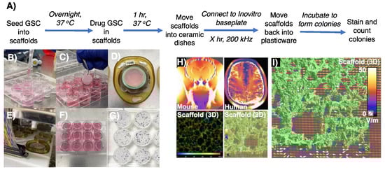 Procedure to assess preclinical TTFields regimens and simulation of TTFields delivery within 3D AlvetexTM scaffolds. (A) A schematic which outlines a protocol to test TTFields alongside drug regimens on 3D AlvetexTM GSC models. (B) Cells were seeded onto Cultrex®-coated AlvetexTM scaffolds and incubated in 2 mL of stem media overnight. (C,D) With sterile tweezers, AlvetexTM scaffolds were moved into the inovitroTM ceramic dishes, secured in place with an insert and sealed with parafilm. (E) Ceramic inovitroTM dishes were connected to the incubated base plate to deliver TTFields. (F) After the treatment time, scaffolds were returned back to their 12-well plastic plate, secured into place and incubated in fresh media to allow colony formation. (G) To visualise colonies, scaffolds were exposed to MTT solution (200 μL/condition, stock 10 mg/mL in PBS) and incubated for 4 h. When colonies were visible, media was aspirated, inserts removed and colonies counted to ascertain cell survival. (H,I) Computer modelling measuring the penetrative power of TTFields throughout 3D AlvetexTM scaffolds, showing effective deliverance with non-uniform, more clinically relevant penetrative power, as seen in a mouse and human model.