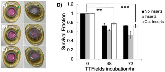 The effects of plastic inserts and TTFields incubation time on 3D GSC survival. InovitroTM ceramic dishes were constructed by moving a GSC cultured 3D AlvetexTM scaffold with (A) no insert, (B) the provided plastic insert to create a domed parafilm seal or (C) cut inserts to create a flat parafilm seal. (D) G1 GSCs were cultured and subjected to TTFields (200 kHz, 1.33 Vcm RMS) for 48 and 72 h in ceramic inovitroTM dishes with no inserts, cut inserts and inserts, and their clonogenic survival was measured after colony formation. n = 3. One-way ANOVA statistical test indicated significant cell killing; 0 h vs. 48 h for cut inserts (p = 0.0026 **; 0 h vs. 72 h (cut inserts), p = 0.0007 ***).