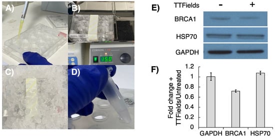 Examining protein expression following TTFields delivery to 3D AlvetexTM cultured GSCs. Following TTFields treatment (72 h, 200 kHz, 1.33 Vcm RMS). (A) Scaffolds were moved back into a 12-well plastic dish and lysed with lysis buffer (100 μL/well). (B) Lysis was promoted by agitation on a plate shaker (150 rpm, 15 min) and then (C) placed on ice for 15 min. (D) Lysates were transferred to Eppendorfs, kept on ice for 30 min and centrifuged, and the supernatant was collected. (E) Western blot analysis examined the effects of TTFields on BRCA1 expression (Figure S1). (F) Band densiometry analysis showed hyperthermia-independent depletion of the BRCA1 protein in response to TTFields (mean −/+ SEM; n = 3).
