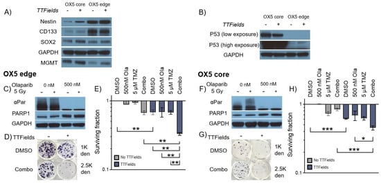 Encouragingly, TTFields effectively reduced GSC survival in combination with TMZ and Olaparib at concentrations validated to be deliverable to the brain [38,39]. This data therefore highlights the utility of our 3D preclinical TTFields delivery methodology to facilitate the assessment of a range of therapeutic TTFields combinations in clinically relevant primary 3D GSC models. Interestingly, the p53 status of OX5 core and edge cells differed (Figure 5B), with OX5 core cells exhibiting hyper expression of a common inactivated p53 form (Arg273 > His), whilst OX5 edge remained p53 WT (confirmed by WES analysis; data not shown). Regardless of this, both OX5 core and edge GSCs were sensitized to TMZ by TTFields and potentiated Olaparib treatments, thus highlighting how our preclinical 3D model may be used to identify potential TTFields-based strategies to potentially overcome common treatment resistive barriers.
