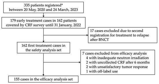 Between 20 May 2020 and 24 March 2023, 364 cases in 334 patients with unresectable LA/LR-HNC and one patient with glioblastoma were registered from the two facilities. Of these, a total of 179 cases from the initial 162 patients treated until 31 January 2022, were included in the survey using CRFs. At least one CRF was collected from all these patients (Figure 1). Collection rates for CRFs are shown in Table 1. These 162 cases were used in the safety analysis. One case received administration of borofalan(10B) but did not undergo neutron irradiation. Six patients were excluded from the safety analysis set, and a total of 155 cases were finally included in the efficacy analysis. Reasons for exclusion were as follows: one case was used off-label for glioblastoma; two cases showed no CRF recovery after six months of BNCT; two cases displayed unknown or unevaluated tumor response; four cases received inadequate neutron irradiation with >2% deviation from dose planning; and two cases had multiple reasons.