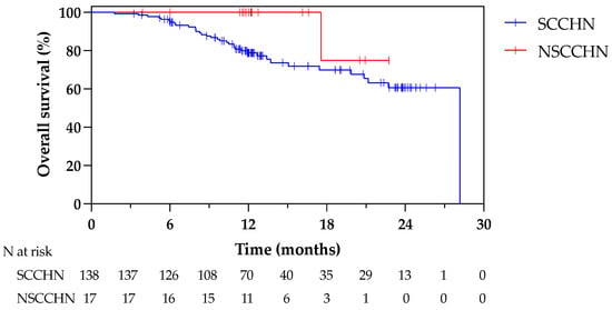 Figure 2 shows Kaplan–Meier curves for OS in patients with recurrent SCC and NSCC. For the 138 patients with SCCHN, 1- and 2-year OS rates were 78.8% and 60.7%, respectively. For the 17 patients with NSCCHN, the 1-year OS was 100%.
