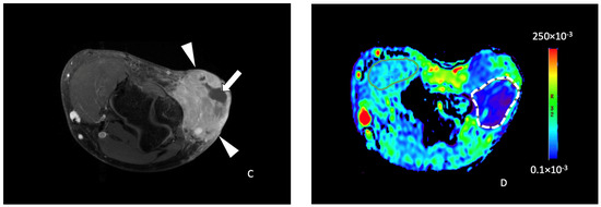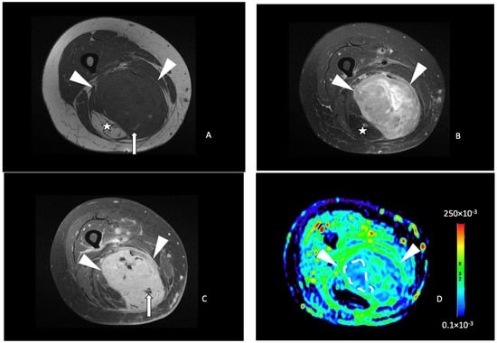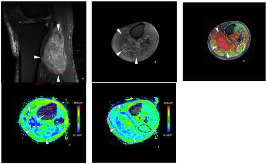 - Teixeira, P.A.; Gay, F.; Chen, B.; Zins, M.; Sirveaux, F.; Felblinger, J.; Blum, A. Diffusion-weighted Magnetic Resonance Imaging for the initial characterization of non-fatty soft tissue tumors: Correlation between T2 signal intensity and ADC values. Skelet. Radiol. 2016, 45, 263–271. [Google Scholar] [CrossRef] [PubMed]