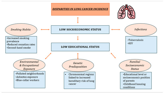 The key contributing factor to low SES is low education. Low educational level is associated with several factors, such as smoking habits, bad lifestyle behaviors, polluted neighborhoods, and genetic-familial risk, that lead to increased lung cancer incidence.