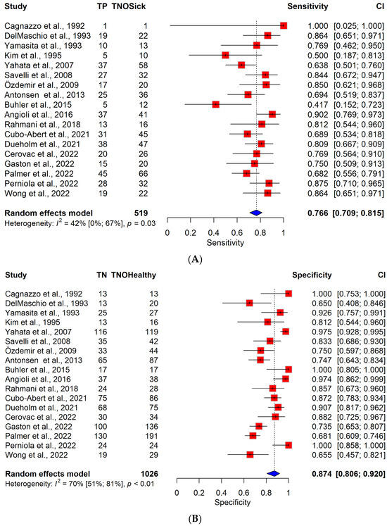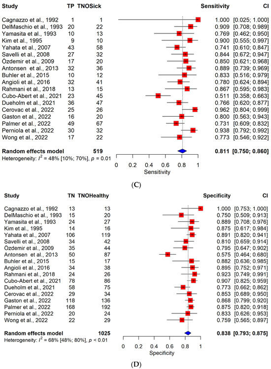 (A) Forest plot of TVS for sensitivity across all articles included [9,14,28,29,30,31,32,33,34,35,36,37,38,39,40,41,42,43]. Abbreviations: TP: number of true positive patients. TN: number of true negative patients. TNOHealthy: total number of healthy patients. TNOSick: total number of patients diagnosed with endometrial cancer. CI: confidence interval. TVS: transvaginal sonography. MRI: magnetic resonance imaging. The results of the pooled model are visualized as well. Each red square represents the point estimate of the effect size for a specific study, and the horizontal line through the square indicates the 95% confidence interval (CI). The blue diamond at the bottom represents the overall pooled effect size, with its width representing the 95% CI. Heterogeneity is indicated by I2 and p-values, representing the variability between the included studies. (B) Forest plot of TVS for specificity across all articles included. (C) Forest plot of MRI for sensitivity across all articles included. (D) Forest plot of MRI for specificity across all articles included.