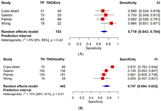 (A) Forest plot of TVS for sensitivity; only low-grade EC articles are included [33,36,39,41]. Abbreviations: TP: number of true positive patients. TN: number of true negative patients. TNOHealthy: total number of healthy patients. TNOSick: total number of patients diagnosed with endometrial cancer. CI: confidence interval. TVS: transvaginal sonography. MRI: magnetic resonance imaging. The results of the pooled model are visualized as well. Each red square represents the point estimate of the effect size for a specific study, and the horizontal line through the square indicates the 95% confidence interval (CI). The blue diamond at the bottom represents the overall pooled effect size, with its width representing the 95% CI. Heterogeneity is indicated by I2 and p-values, representing the variability between the included studies. (B) Forest plot of TVS for specificity, with only low-grade EC articles included. (C) Forest plot of MRI for sensitivity, with only low-grade EC articles included. (D) Forest plot of MRI for specificity, with only low-grade EC articles included.