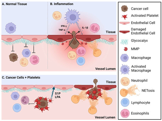 Inflammation and platelet-induced vascular endothelial permeability increases the extravasation of cancer cells into pre-metastatic sites. (A) The vessel lumen-facing glycocalyx acts as a barrier that limits extravasation of cancer cells and immune cells. (B) During inflammation, the glycocalyx is degraded by matrix metalloproteases (MMPs) and neutrophil extracellular traps (NETs) which increase vascular permeability and cellular extravasation from the vessel lumen. Additionally, during inflammation, activated macrophages in the tissue produce the cytokines TNFα, IFN-γ and IL-1β among others which can further increase endothelial permeability. (C) Circulating cancer cells aggregate with platelets, thus avoiding shear stress and immune cell recognition. These platelets are attracted to damaged endothelial cells and will also release sphingosine 1-phosphate (S1P) and lysophosphatidate (LPA), two bioactive lipids that when locally elevated will increase vascular endothelial permeability and cancer cell extravasation. NETs produced by activated neutrophils can also capture the circulating cancer cell/platelet complexes, facilitating their entry into the tissue. Created with BioRender.com.