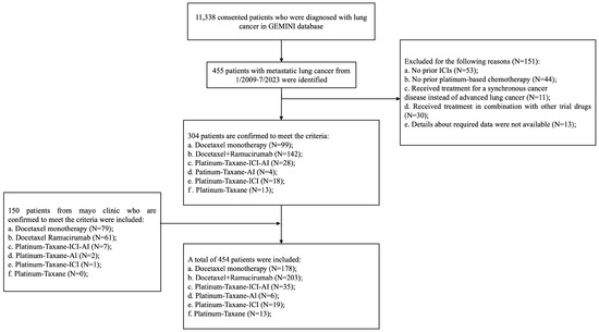 The University of Texas MD Anderson Lung Cancer Moon Shot GEMINI (Genomic Marker-Guided Therapy Initiative) database contains information on consenting patients with lung cancer, including demographics, smoking history, treatment history, clinical outcomes, and tumor molecular profiling, etc. We queried the GEMINI database to identify patients who were treated at the MD Anderson Cancer Center between January 2009 and July 2023 who met the following criteria. (1) They had to be male/female patients (at least 18 years of age) with a histologically confirmed diagnosis of NSCLC including the following subtypes: adenocarcinoma, squamous cell carcinoma, adenosquamous carcinoma, non-small-cell carcinoma NOS (not otherwise specified), sarcomatoid carcinoma, large cell neuroendocrine carcinoma, etc. (2) Patients must have progressed on platinum-based chemotherapy (cisplatin 75 mg/, day 1 + pemetrexed 500 mg/, day 1, every 3 weeks; cisplatin 75 mg/, day 1 + gemcitabine 1000 mg/ or 1250 mg/, days 1 and 8, every 3 weeks; cisplatin 75 mg/, day 1 + docetaxel 75 mg/, day 1, every 3 weeks; cisplatin 50 mg/, days 1 and 8 + vinorelbine 25 mg/, days 1, 8, 15, and 22, every 4 weeks; cisplatin 100 mg/ day 1 + vinorelbine 30 mg/ days 1, 8, 15, and 22, every 4 weeks; cisplatin 75–80 mg/, day 1 + vinorelbine 25–30 mg/, days 1 and 8, every 3 weeks; cisplatin 100 mg/ day 1 + etoposide 100 mg/, days 1–3, every 4 weeks; carboplatin AUC 5 or AUC 6, day 1 + paclitaxel 175 mg/ or 200 mg/, day 1, every 3 weeks; carboplatin AUC 5 or AUC 6, day 1 + gemcitabine 1000 mg/, days 1 and 8, every 3 weeks; carboplatin AUC 5 or AUC 6, day 1 + pemetrexed 500 mg/, day 1 every 3 weeks, etc.) and any of the FDA-approved PD-1 or PD-L1 immune checkpoint inhibitors, either given sequentially or in combination. (3) Patients had to have received docetaxel monotherapy (75 mg/, day 1, every 3 weeks), docetaxel plus ramucirumab (docetaxel 75 mg/, day 1 + ramucirumab 10 mg/kg, day 1, every 3 weeks), or platinum/taxane-based regimens (a. carboplatin AUC 5 or AUC 6, day 1 + paclitaxel 175 mg/ or 200 mg/, day 1 + atezolizumab 1200 mg, day 1 + bevacizumab 15 mg/kg, day 1, every 3 weeks; b. carboplatin AUC 5 or AUC 6, day 1 + paclitaxel 175 mg/ or 200 mg/, day 1 + bevacizumab 15 mg/kg, day 1, every 3 weeks; c. carboplatin AUC 5 or AUC 6, day 1 + paclitaxel 175 mg/ or 200 mg/, day 1 + atezolizumab 1200 mg, day 1, every 3 weeks; d. carboplatin AUC 5 or AUC 6, day 1 + docetaxel 75 mg/, day 1, every 3 weeks + pembrolizumab 200 mg, day 1, every 3 weeks or 400 mg, every 6 weeks; e. carboplatin AUC 5 or AUC 6, day 1 + paclitaxel 150 mg/, day 1, every 3 weeks + pembrolizumab 200 mg, day 1, every 3 weeks or 400 mg, day 1, every 6 weeks; f. carboplatin AUC 5 or AUC 6, day 1 + paclitaxel 150 mg/, day 1 + nivolumab 360 mg, day 1, every 3 weeks; g. cisplatin 75–100 mg/, day 1 + paclitaxel 150 mg/, day 1, every 3 weeks + pembrolizumab 200 mg, day 1, every 3 weeks or 400 mg, day 1, every 6 weeks; h. carboplatin AUC 5 or AUC 6, day 1 + docetaxel 75 mg/, day 1, every 3 weeks; i. carboplatin AUC 5 or AUC 6, day 1 + paclitaxel 150 mg/, day 1, every 3 weeks) after progression on concomitant or sequential platinum doublets and ICIs. (4) For patients with squamous carcinoma, who received platinum/taxane and immunotherapy sequentially, they must have had platinum doublets as a first-line therapy followed by immunotherapy. For patients with squamous carcinoma, who received concurrent platinum/taxane and immunotherapy, they must have progressed on maintenance immunotherapy. (5) Patients had to have baseline imaging and at least one repeated radiological examination. (6) Patients had to be at stage IV NSCLC when each treatment mentioned above started. The baseline characteristics of the patients, including age, gender, smoking history, family history, histology, Eastern Cooperative Oncology Group (ECOG) performance status when treatment started, baseline metastatic sites, cancer gene mutation status, PDL1 expression, prior treatment history, etc., were obtained for data analysis. PD-L1 and genomic profiling data were collected from pathology reports, as previously reported [19,21]. An external cohort that met the inclusion criteria from the Mayo Clinic was also included for analysis. This study was approved by the institutional review board at the MD Anderson Cancer Center and Mayo Clinic. Written informed consent was obtained from all patients at the MD Anderson Cancer Center and was waived due to the retrospective nature of the study for patients at the Mayo Clinic. The study was conducted in accordance with the Declaration of Helsinki.