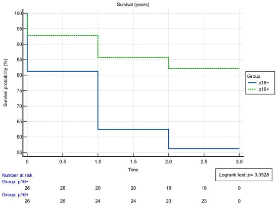 Additionally, the inverse relation, namely the cases that did not reach the 3-year survivability mark, further emphasizes this disparity. In the p16+ group, only 5 out of 28, which translates to 17.86%, did not survive past 3 years. Meanwhile, the p16− cohort displayed a more pronounced number of nonsurvivors, tallying 14 out of 32, or 43.75% of their total count. Survivability was also assessed using the Kaplan–Meier analysis, as can be observed in Figure 1. The Kaplan–Meyer probability curve of mortality p16+ and p16− patients showed different, statistically significant risks (log-rank p-value = 0.0328).