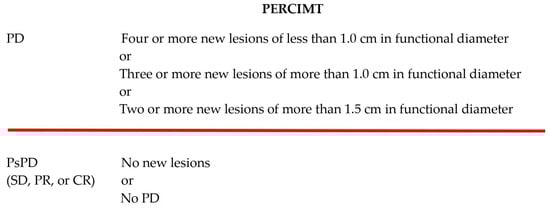 - Anwar, H.; Sachpekidis, C.; Winkler, J.; Kopp-Schneider, A.; Haberkorn, U.; Hassel, J.C.; Dimitrakopoulou-Strauss, A. Absolute number of new lesions on 18F-FDG PET/CT is more predictive of clinical response than SUV changes in metastatic melanoma patients receiving ipilimumab. Eur. J. Nucl. Med. Mol. Imaging 2018, 45, 376–383. [Google Scholar] [CrossRef] [PubMed]