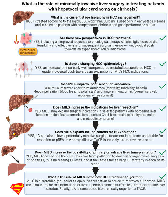 Review outline. Created in BioRender. HCC: hepatocellular carcinoma; MILS: minimally invasive liver surgery; LA: laparoscopic ablation; BCLC: barcelona clinic liver cancer; TACE: trans-arterial chemo-embolization.