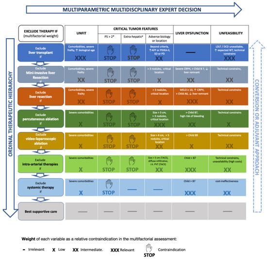 As discussed in a Lancet Oncology paper [80], the central limit of the BCLC system is its intrinsic “stage hierarchy” nature. Stage hierarchy means that HCC stages or sub-stages dictate treatment choice, increasing the patient’s risk of undertreatment. An exciting alternative to the stage hierarchy philosophy is the ordinal therapeutic hierarchy approach, in which treatment choice is totally or partially independent from the tumor stage, and treatment options are hierarchically ordered according to survival benefits [81,82]. However, an utterly liberal treatment hierarchy approach may increase the patient’s risk of over-treatment [81]. A solution to the limits of both stage and therapeutic hierarchy concepts is the recent proposal of a multi-parametric treatment hierarchy approach (Figure 1) [80]. In this proposal, the multi-parametric evaluation of a multidisciplinary expert team balances the ordinal therapeutic hierarchy risk of overtreating HCC patients [65].