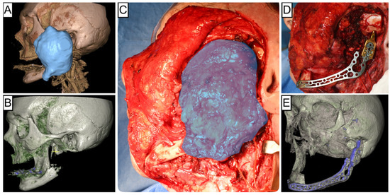 Illustration of an extended osteosarcoma located in the left ascending mandible. Preoperative 3D CT reconstruction highlighting the tumor volumetry in blue (A), 3D reconstruction showing the affected mandibular branch (B), clinical intraoperative view with the tumor outlined in blue (C), post-resection intraoperative view following alloplastic reconstruction (D), and postoperative 3D CT reconstruction depicting the surgical result (E).