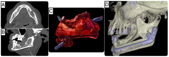 Case of an oral squamous cell carcinoma in the left mandible, with osseous infiltration. (A) Axial and (B) sagittal views from preoperative CT imaging. (C) Resected tumor specimen. (D) Postoperative situation after autologous and alloplastic (patient-specific implant) reconstruction as 3D image.