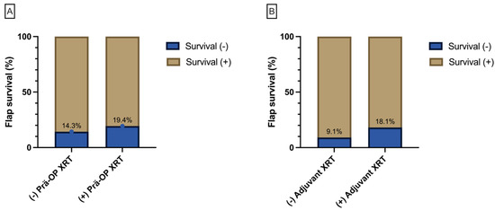 The bar graph displays the percentage of free flap survival for preoperative radiotherapy (A) and its correlation with the status of adjuvant radiotherapy (B).
