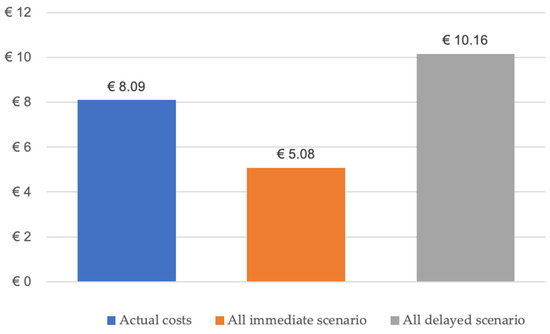 From 2010 to 2023, mandibular reconstruction following tumor resection was performed on 177 patients. Immediate reconstructions were conducted in 72 cases, while 105 were delayed reconstructions. The accumulated revenue for the immediate reconstructions during this span would have amounted to EUR 2,066,784.48, taking an average income per case of EUR 28,705.34 (mean annual base case value from 2010 to 2023), presenting the appropriate categorization of DRG-D02A, denoting complex head and neck resections with intricate or combined procedures with extremely severe CC. To compare the treatment costs of different therapeutic regimens, it is essential to account for the sum of expenses/revenues from the procedure with continuity resection and the isolated delayed reconstruction (bone reconstruction). Hence, during the specified period, the total invoiced payment for the delayed reconstruction amounted to EUR 6,028,121.40. This would result in an estimated amount for immediate and delayed reconstructions of EUR 8,094,905.88. Had all 177 reconstructions been executed as immediate procedures (EUR 5,080,845.18), there would have been a revenue decrease for the clinics or a health expenditure reduction of EUR 3,014,060.70 (−37%). In comparison, had all reconstructions been executed as delayed procedures (EUR 10,161,690.36), the clinics’ revenue would have been increased by EUR 2,066,784.48 (Figure 4).