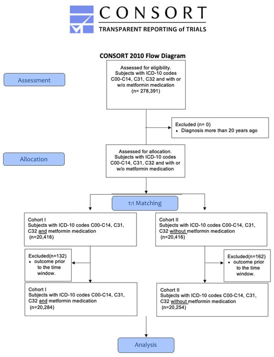 The TriNetX database houses medical records of over 80 healthcare organizations (HCOs) across 30 countries, primarily used to record and analyze clinical data for research purposes. In this study, data of patients diagnosed with HNC (International Classification of Diseases [ICD]-10 codes C00-C14, C31, and C32) between 5 and 20 years before the access date (18 January 2024) were extracted from the TriNetX Global Health Research Network. This utilized workflow has previously been implemented in our group’s other studies [23,24]. The inclusion criteria required medical records covering at least 5 years (1825 days) of follow-up after visiting the HCO for inpatient encounters. Cohort I and cohort II were formed as follows: cohort I comprised individuals with diagnosed HNC on metformin medication, while cohort II included individuals with HNC not on metformin medication. Subsequently, randomization was achieved by one-to-one matching for age, sex, BMI, nicotine dependence, alcohol abuse/dependence, and diabetes type 2 (ICD-10: Z87.891 and F10.1, or F10.2 and E11).