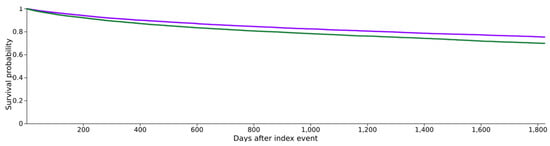Figure 2. Kaplan–Meier survival curves for both cohorts, with purple indicating cohort I (HNC with metformin medication) and green indicating cohort II (HNC without metformin medication).