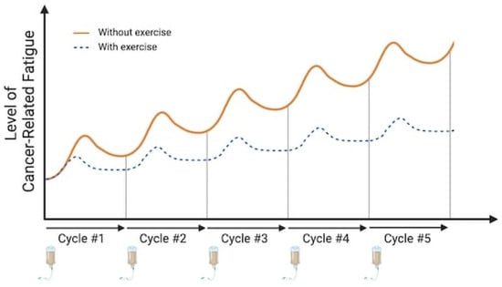 Kinetics of cancer-related fatigue depending on the cycle of chemotherapy treatment and exercise. Figure 1 illustrates the kinetics of CRF in relation to chemotherapy treatment cycles and their cumulative effect. The orange curve depicts a characteristic pattern of CRF intensity following each treatment cycle. A peak in CRF is observed between 3 and 5 days post-treatment, followed by a recovery period in the subsequent days. Notably, the intensity of CRF progressively increases with the accumulation of treatments. The blue curve depicts the fatigue kinetics when physical exercise is incorporated during treatment cycles, highlighting the potential for chronic effects. Here, a marked reduction in CRF intensity is observed compared to the no-exercise scenario. Additionally, the cumulative anti-cancer treatment effect appears less pronounced with exercise intervention. This observation suggests that the acute effect of exercise, practiced within a treatment cycle, might contribute to a gradual attenuation of CRF over time, potentially reflecting the cumulative impact of acute exercise. Image created with Biorender.com (accessed on 6 December 2023).