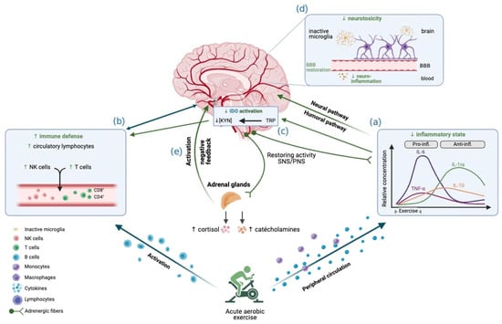 Effects of acute aerobic exercise on CRF, integrated into the conceptual model. The reduction in CRF observed following aerobic exercise may be explained by these mechanisms: Aerobic exercise, particularly when performed at high intensity, is associated with an anti-inflammatory effect during the first few hours after exercise, possibly transiently alleviating chronic peripheral inflammation (a). Aerobic exercise promotes the mobilization of circulating lymphocytes, thus helping to restore immune function (b). This reduction in inflammation would lead to a reduction in the activation of IDO (c), with effects accentuated by vigorous intensity. The restoration of BBB function prevents the passage of pro-inflammatory cytokines into the CNS, which decreases microglia activation and therefore prevents neurotoxic damage (d). Aerobic exercise manages to re-regulate the activation of the HPA axis (e), notably by recovering the amplitude of cortisol release, while promoting a better sensitivity to glucocorticoids and restoring the negative feedback loop. Image created with Biorender.com (accessed on 22 September 2022).