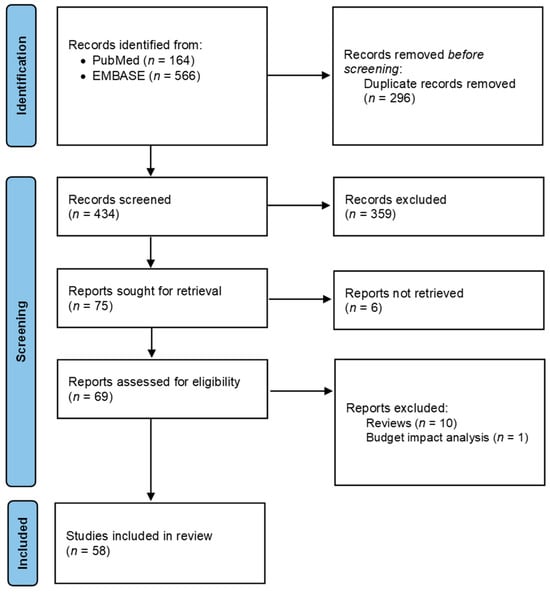 A total of 730 articles were identified through the systematic literature search across different bibliographic database queries. As reported in Figure 1, 295 (40.4%) duplicates were removed and 435 abstracts (59.6%) were screened, resulting in 76 studies potentially evaluable. After excluding six papers for which the full-text was not retrieved, a total of 70 full-text articles were examined. Among these papers, 10 systematic reviews and one paper based on a budget impact analysis model were excluded, for a total of 58 studies that met the inclusion criteria.