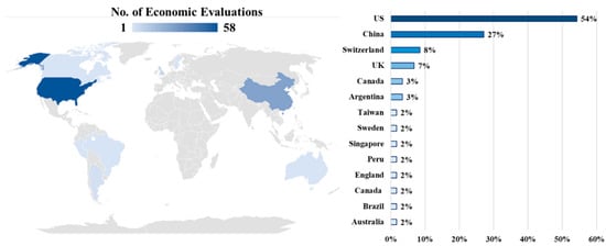 The geographical distribution of papers reporting an economic evaluation of an ICI associated to a biomarker test showed a marked majority of studies conducted in the US (56%; n = 33) and China (27%; n = 16). Figure 2 shows the worldwide distribution of studies included.
