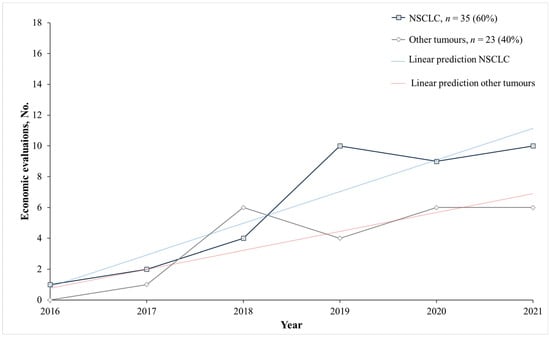 Economic evaluations of an ICI associated with a biomarker test per year focused on solid tumour diagnoses. Other tumours: Urothelial, bladded and renal cell cancer, cervical cancer, gastric cancer, head and neck cancer squamous cell carcinoma; melanoma; Merkel cell carcinoma, triple-negative breast cancer. Abbreviations: Non-small cell lung cancer (NSCLC). Notes: Dotted lines are estimates of linear predictions on the yearly trend of economic evaluations of ICIs associated with biomarker testing in NSCLC (blue dotted line) and other solid tumours (red dotted line).