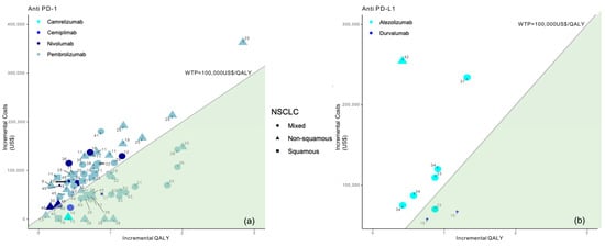 Results from the different studies on a cost-effectiveness plane for NSCLC patients according to anti PD-1 (a) or anti PD-L1 therapy (b). Note: Studies in the figure are identified by reference number.