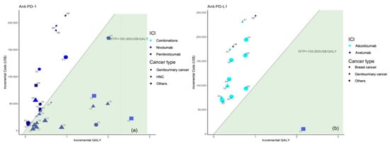 In more detail, five economic evaluations [44,45,46,47,49] were carried out on patients diagnosed with urothelial cancer, demonstrating that avelumab (n = 1) [45] and pembrolizumab (n = 2) [46,47] were cost-effective in first-line treatment when preceded by PD-L1 testing (with thresholds set in the US and Switzerland) with greater impact on the survival benefit of patients. Conversely, first-line treatment with atezolizumab (n = 1) [44] and second-line treatment with pembrolizumab [49] (n = 1) were not cost-effective with a threshold of $150,000/QALY in a US setting.