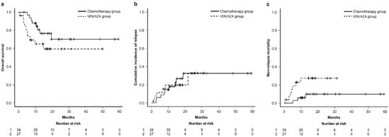 Cumulative incidence and survival analyses according to treatment (VEN/AZA group versus chemotherapy group) (a) overall survival; (b) cumulative incidence of disease relapse; (c) cumulative incidence of non-relapse mortality.