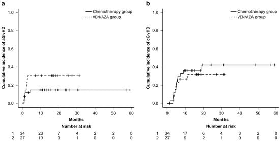 (a) Cumulative incidence of grade 2–4 acute GVHD and (b) chronic GVHD according to treatment (VEN/AZA group versus chemotherapy group).