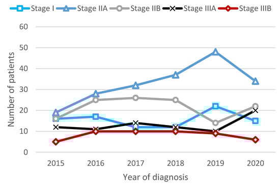 We observed a significant increase in neoadjuvant systemic treatment use during the study period, on average from 45% in 2015 to 89% in 2020, especially in stages IIA and IIB (Supplementary Materials: Table S4). Notably, systemic neoadjuvant therapy was administered to 21 patients (22.3%) with tumour stage I, but only with tumour size T1c, and to over 83% of patients with stage IIIA/B (refer to Table 2).